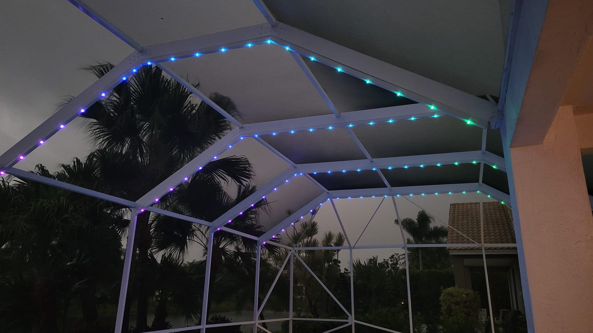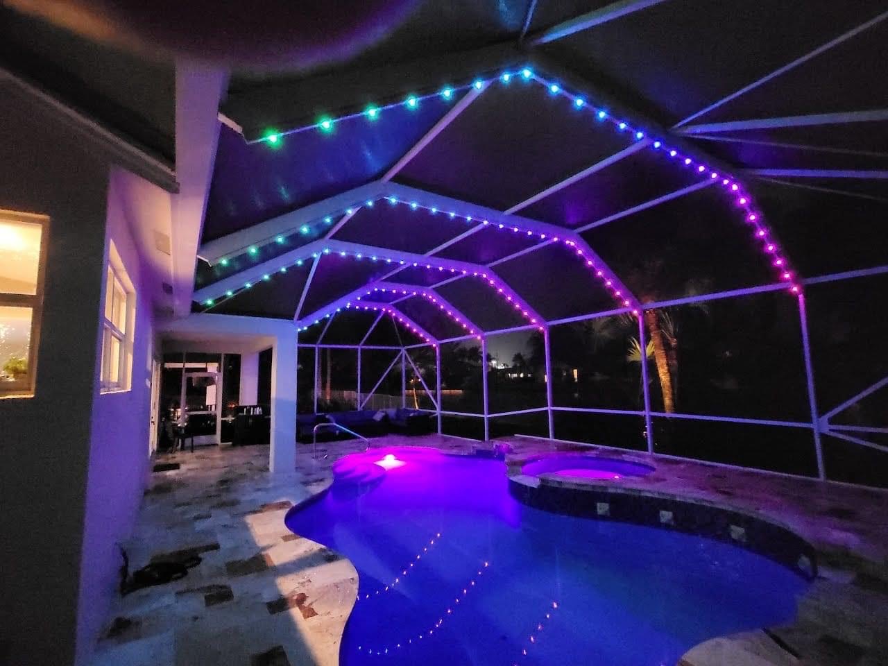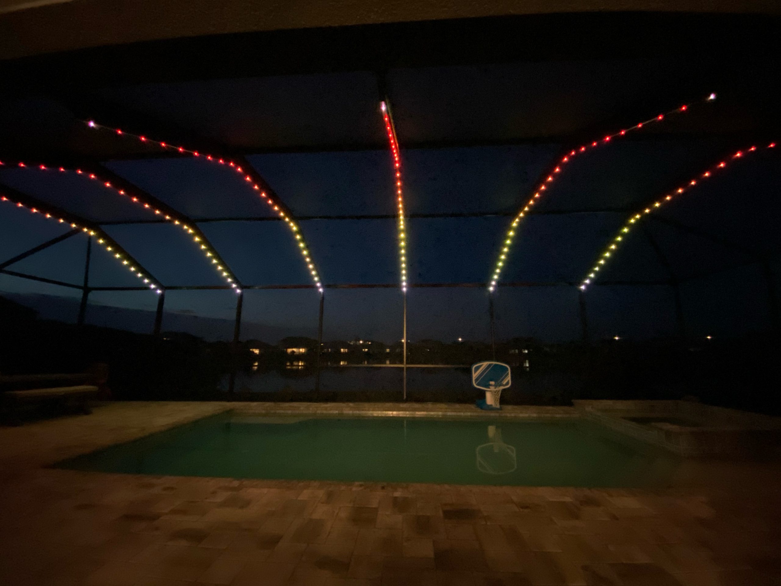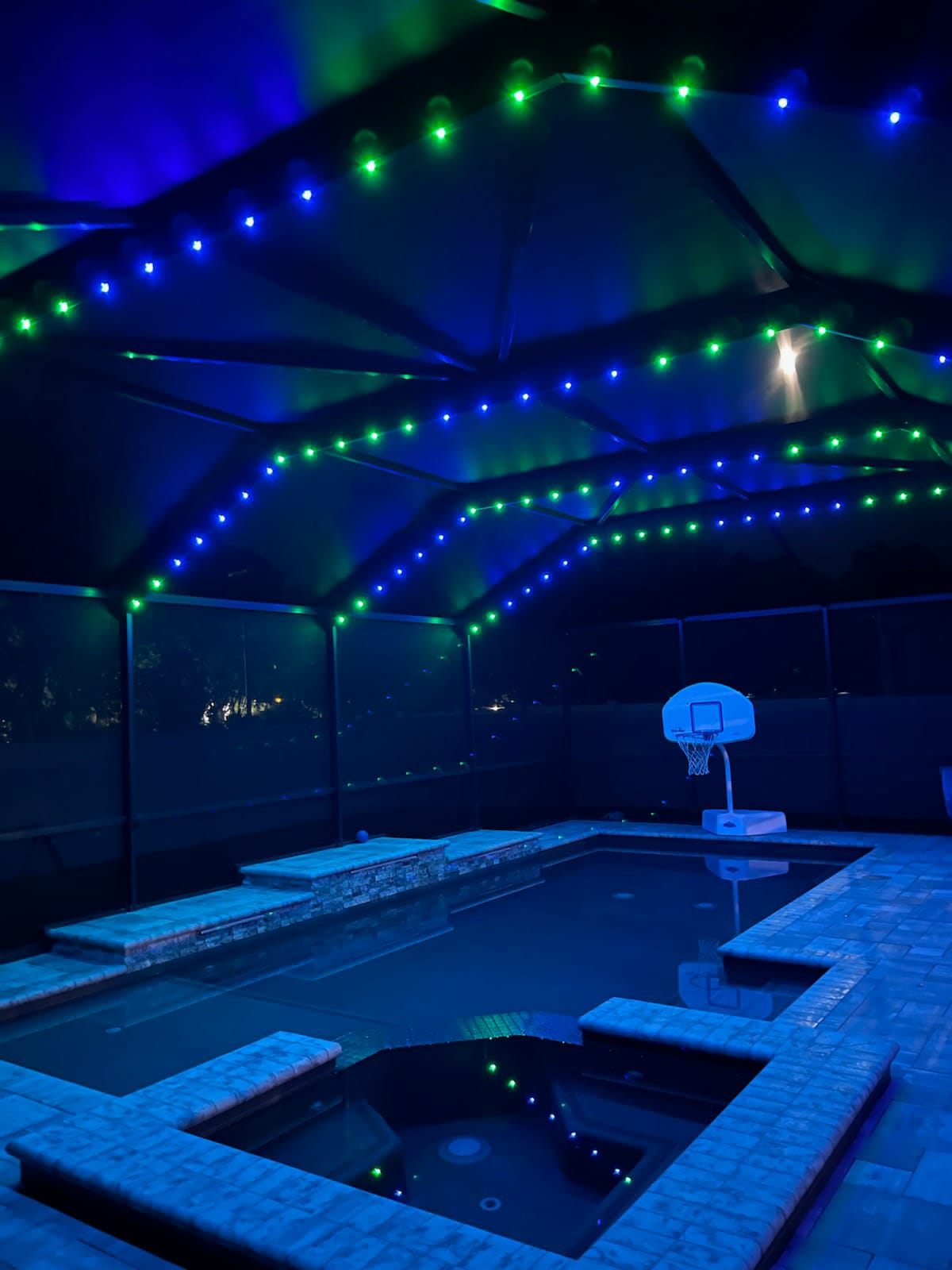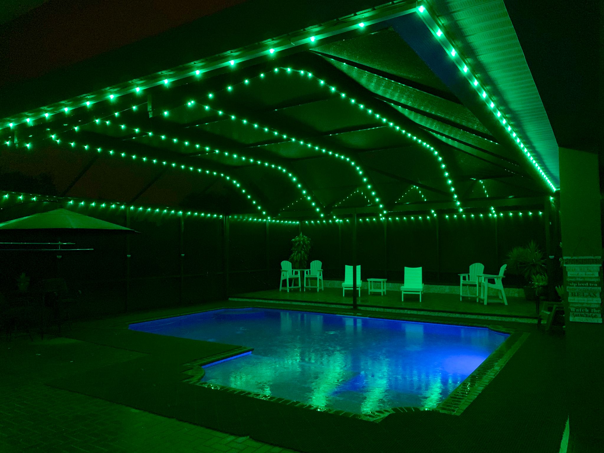 - Our pool cage lighting is a low-voltage lighting system. It is NEVER recommended and explicitly no allowed by the National Electrical Code for 120 volt lighting systems to be used around your pool. All wires are hidden during installation, leaving a professional, clean look that will continue to look great and be reliable for many years to come. You have spent time and money on your screen enclosure, so show off your investment and make it a usable space to entertain your guests. Re-create that soothing “sunset” lighting all evening long! Enjoy your outdoor living space by adding our luxurious pool cage and lanai lighting system. Have a patio or deck with no screen enclosure? We have the perfect solution to accentuate your back area. Whether you are having an intimate dinner or a birthday celebration, our programmable LED system will light up your patio or deck every way possible. And when not celebrating, set your daily function to give you the lighting you need to be able to enjoy your backyard year-round. Bay Area Trimlight offers all the options for your pool or patio such as BEAM LIGHTS, LANAI LIGHTS, and STRING LIGHTS, but we don’t stop there. Have a Boat Dock, Gazebo, Pergola or Aluminum Fence line you want lit up? Our water resistant, programmable LED system is the perfect touch to highlight those outdoor areas.