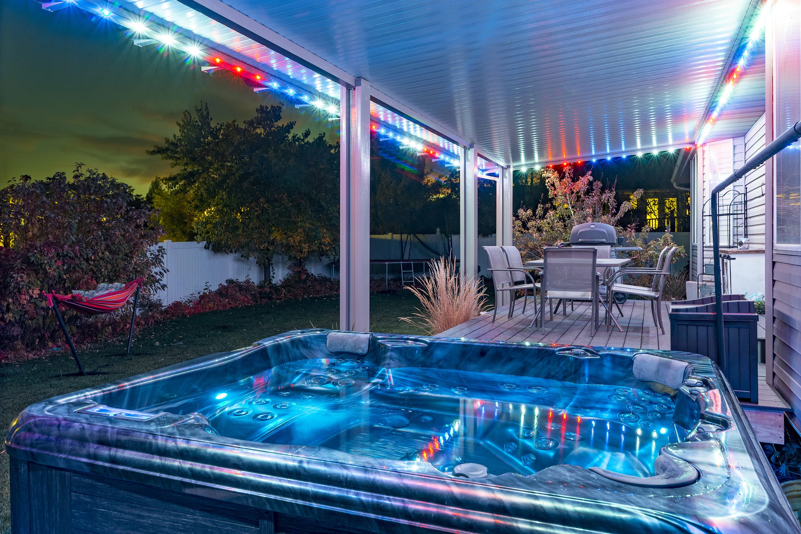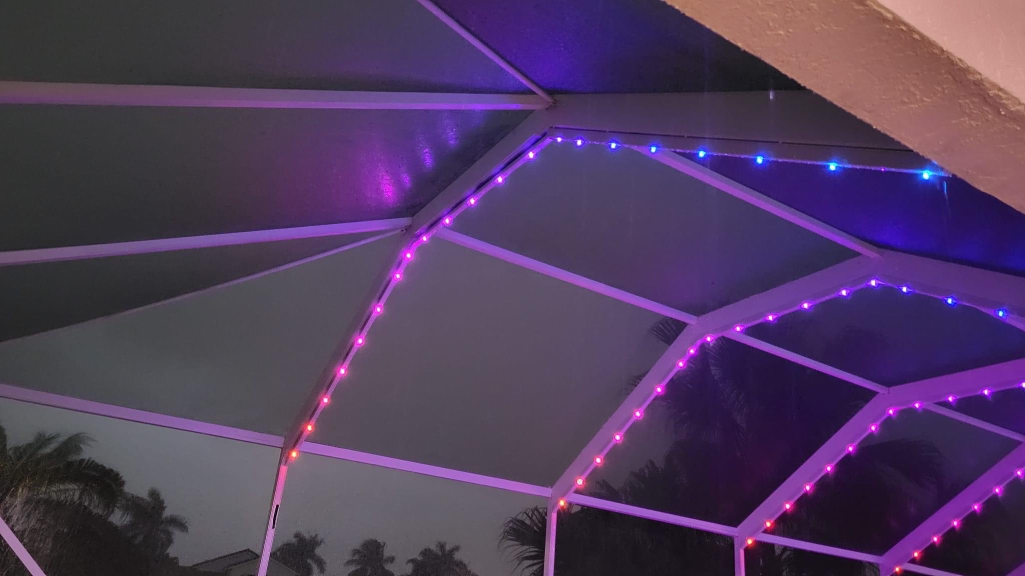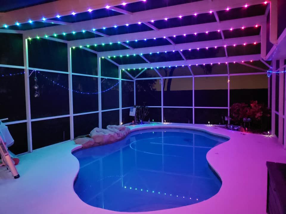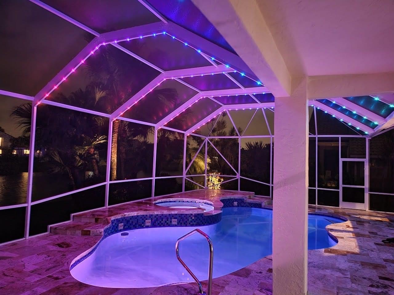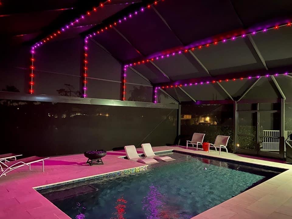 - Our pool cage lighting is a low-voltage lighting system. It is NEVER recommended and explicitly no allowed by the National Electrical Code for 120 volt lighting systems to be used around your pool. All wires are hidden during installation, leaving a professional, clean look that will continue to look great and be reliable for many years to come. You have spent time and money on your screen enclosure, so show off your investment and make it a usable space to entertain your guests. Re-create that soothing “sunset” lighting all evening long! Enjoy your outdoor living space by adding our luxurious pool cage and lanai lighting system. Have a patio or deck with no screen enclosure? We have the perfect solution to accentuate your back area. Whether you are having an intimate dinner or a birthday celebration, our programmable LED system will light up your patio or deck every way possible. And when not celebrating, set your daily function to give you the lighting you need to be able to enjoy your backyard year-round. Bay Area Trimlight offers all the options for your pool or patio such as BEAM LIGHTS, LANAI LIGHTS, and STRING LIGHTS, but we don’t stop there. Have a Boat Dock, Gazebo, Pergola or Aluminum Fence line you want lit up? Our water resistant, programmable LED system is the perfect touch to highlight those outdoor areas.